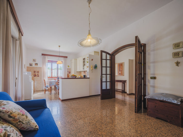 Huis 3-kamers 80 m2, op verhoogde begane grond. Mooi en gezellig ingericht: 1 2-pers. kamer met air-conditioning. 1 kamer met 2 bedden. Woonkeuken (oven, afwasmachine, 4 kookpitten (vlammen), broodrooster, magnetron, elektrische koffiemachine) met open haard (alleen decoratie), eettafel, TV en Flatscreen TV. Uitgang naar het terras. Bad/bidet/WC, douche/bidet/WC. Geen verwarmingsmogelijkheid. Klein terras 8 m2. Terrasmeubelen, ligstoelen (2). Ter beschikking: wasmachine, strijkijzer, kinderstoel, kinderbed tot 2 jaar, haardroger. Internet (WiFi). Parkeerplaats (omheind). Rookvrij huis. Rookmelders, brandblusser. IT045010C2GRH7ZW8S