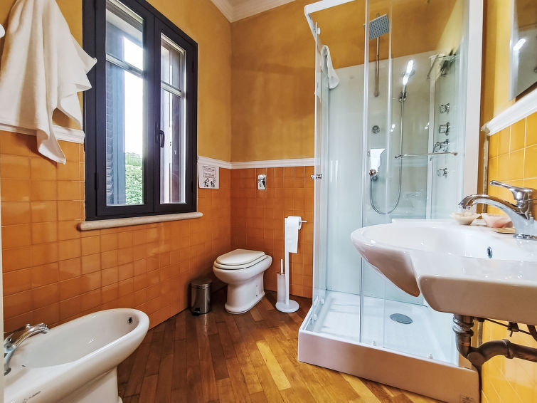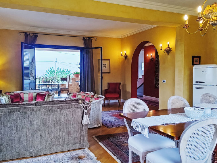 Halfvrijstaand huis 4-kamers 150 m2, op de begane grond. Comfortabel en smaakvol ingericht: woon-/eetkamer met air-conditioning en heteluchtverwarming. Uitgang naar de tuin. 1 2-pers. kamer met douche/bidet/WC en air-conditioning. Uitgang naar de tuin. 1 2-pers. kamer met air-conditioning. Uitgang naar het terras. 1 kamer met 1 bed, 1 uitschuifbaar bed en air-conditioning. Kookhoek (mini-oven, afwasmachine, 2 kookpitten (vlammen), broodrooster, waterkoker, magnetron, elektrische koffiemachine). Bad/bidet/WC, douche/bidet/WC, aparte WC. Verwarming, heteluchtverwarming. Verwarming alleen beschikbaar van 01.12. tot 31.03. Parketvloeren, vloerbedekking. Balkon 8 m2, terras 24 m2, overdekt. Terrasmeubelen, barbecue. Panoramazicht op zee en de tuin. Ter beschikking: wasmachine, kluis, strijkijzer, kinderstoel, kinderbed tot 2 jaar (extra), haardroger. Internet (Internet (WiFi), gratis). Rookmelders, brandblusser. IT089001C2LT8AWL3A